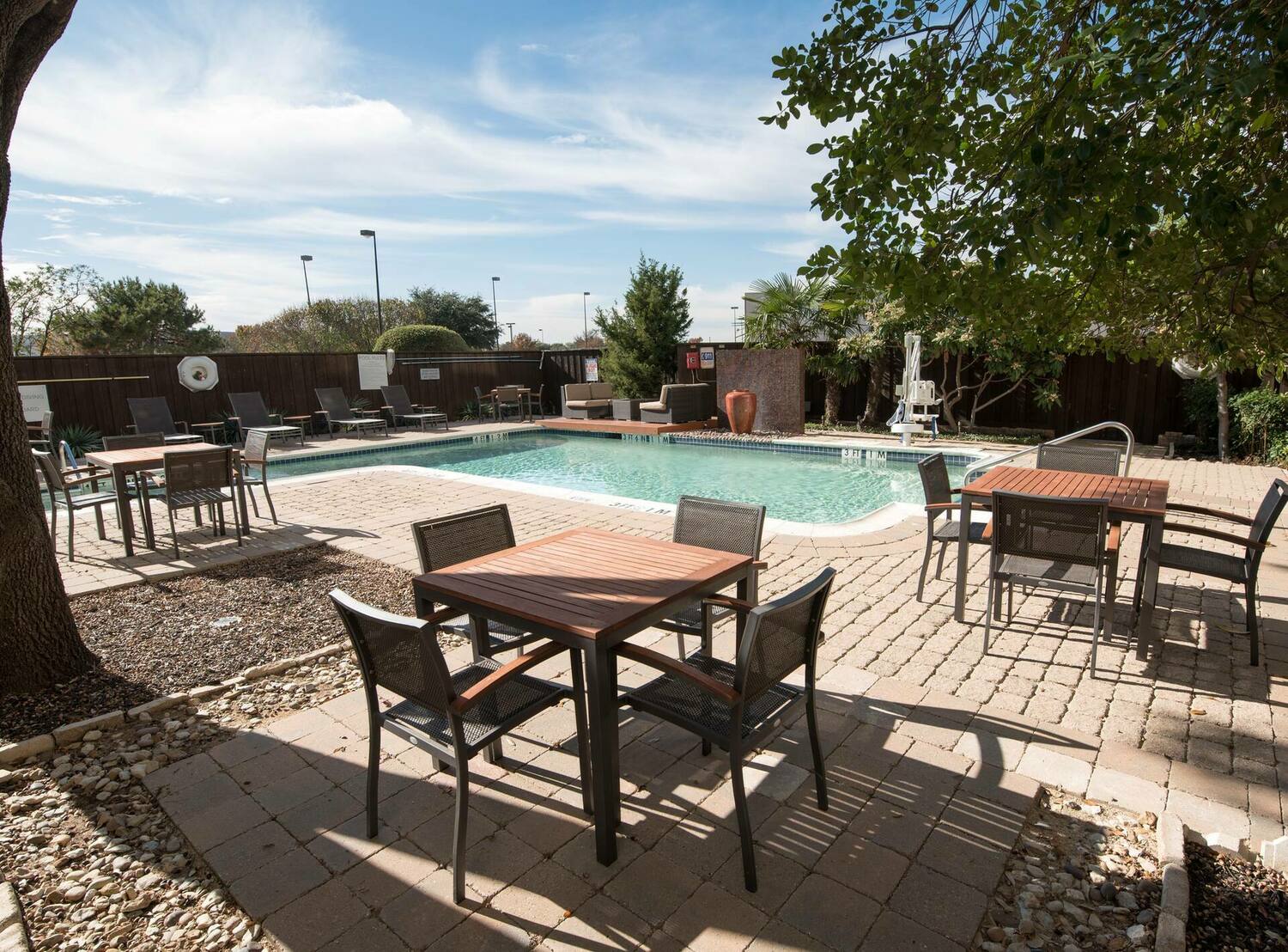 Find us off I-635 and President George Bush Turnpike, near shops and restaurants. Toyota Music Factory, Cypress Waters, and DFW Airport are less than 10 minutes away. Downtown Dallas is 20 minutes from our door. We have an outdoor pool with terrace, the Garden Bar & Grille, and meeting space. WiFi and parking are on us.